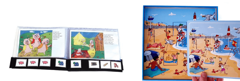 Phrasobox – La plage, le camping, l’anniversaire : Cet outil pédagogique multisupport est destiné à travailler la compréhension orale ou écrite de phrases ainsi que la capacité à faire des déductions. Il permet à l’enfant de compléter trois scènes en plaçant des cubes au bon endroit et sur la bonne face à partir d’indices donnés par des cartes descriptives, une seule face du cube étant correcte. Il est adapté aux enfants ayant des difficultés de compréhension et peut être utilisé avec tous les enfants de maternelle pour développer l’attention, le raisonnement et la compréhension du langage. Le jeu propose trois niveaux de lecture de complexité croissante ainsi qu’un niveau « pictogramme » ne nécessitant pas l’accès à la lecture, avec une lecture facilitée par des syllabes de couleurs différentes. Le kit comprend une boîte support, trois plateaux, neuf cubes en carton (4 × 4 cm), trois fiches pictogrammes et neuf fiches textes, avec la possibilité de télécharger neuf planches supplémentaires. Dès 3 ans.