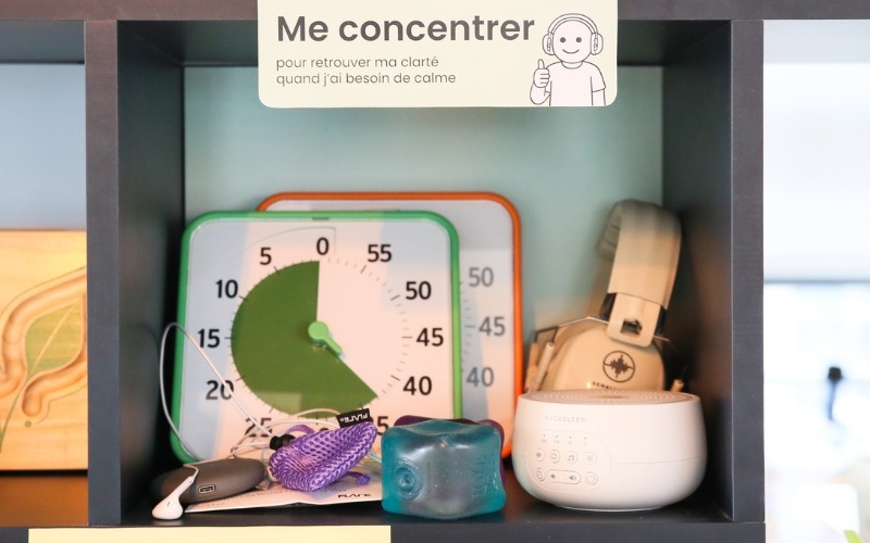 Pour retrouver ma clarté quand j’ai besoin de calme, d’un cadre clair et de repères visuels. Sur cette étagère, vous pouvez y mettre par exemple : un casque antibruit, un générateur de bruits blancs, un Time Timer et quelques fidgets.
