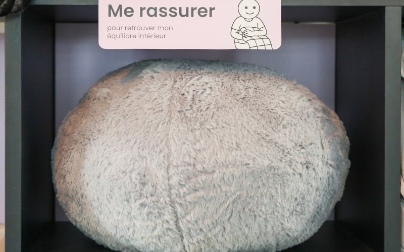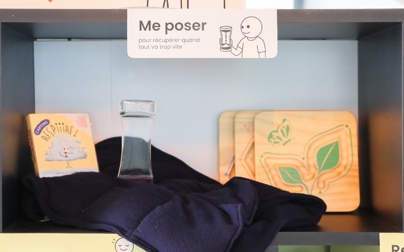 Pour récupérer quand je sens que tout va trop vite, que j’ai besoin de couper et de me recentrer. Vous pouvez y mettre : un kit de labyrinthes apaisants, des sabliers liquides ainsi qu’une couverture lestée.