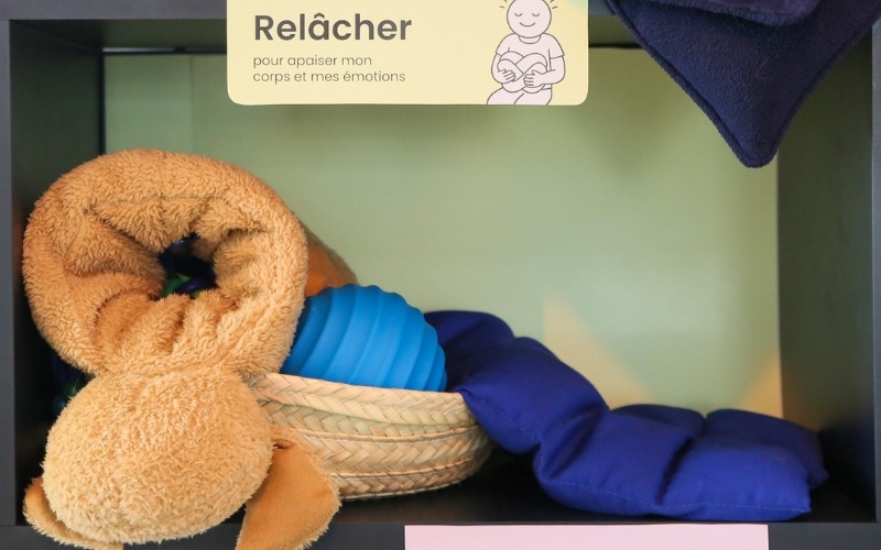 Pour calmer mon corps et mes émotions quand je me sens tendu ou trop plein à l’intérieur. Dans cet espace, vous pouvez y mettre un collier de massage vibrant, un coussin nœud, une balle anti-stress smiley et encore une balle de massage vibrante.