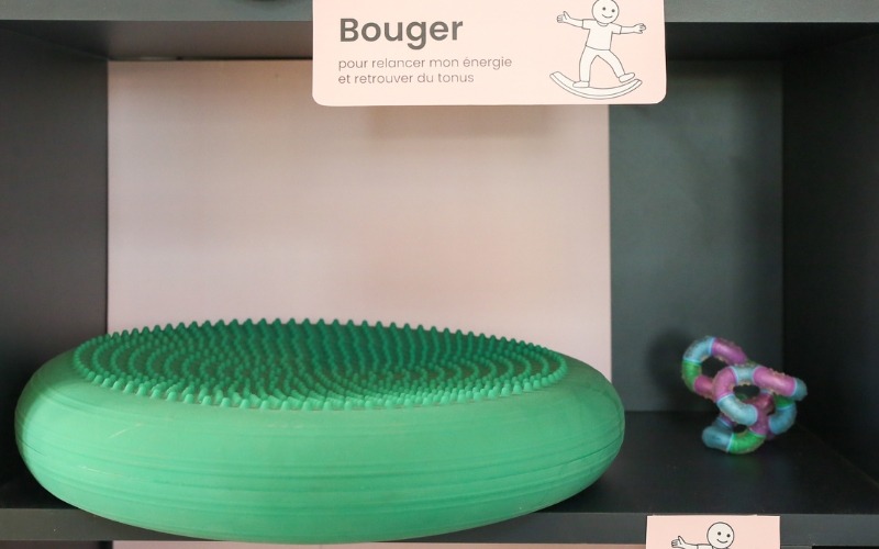 Pour redonner de l’énergie à mon corps quand j’ai besoin de bouger ou de me réveiller. Dans cet espace, vous pouvez y mettre : un coussin dynair rond à picots, le busylegz et un tapis de massage de pieds.