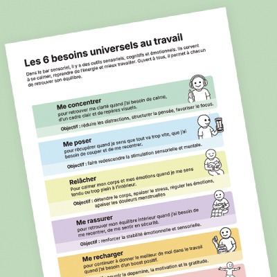 Dans le bar sensoriel, il y a des outils sensoriels, cognitifs et émotionnels. Ils servent à se calmer, reprendre de l’énergie et mieux travailler. Ouvert à tous, il permet à chacun de retrouver son équilibre. Retrouvez en téléchargement gratuit, une infographie sur les 6 besoins universels au travail à imprimer et à afficher !