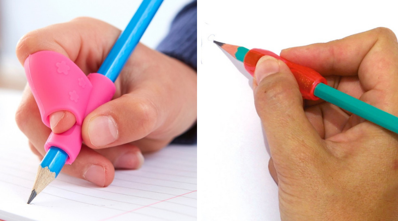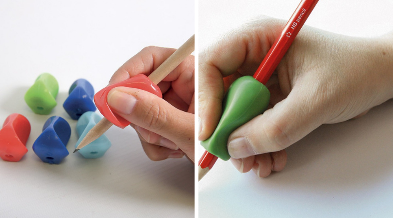 Certains outils comme les manchons ci-dessous sont adaptés plutôt pour avoir du confort dans l’écriture. Ici il n’est pas question de position des doigts mais plutôt de rendre la tenue du crayon et l’écriture plus agréable.