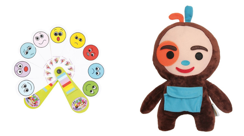 Poupée émotions : Un compagnon pour encourager les enfants à exprimer facilement leurs sentiments et aider les autres à comprendre comment ils se sentent. Chaque élément expressif de son visage existe en plusieurs versions, équipées d’un scratch, afin de transformer l’expression faciale de la peluche.