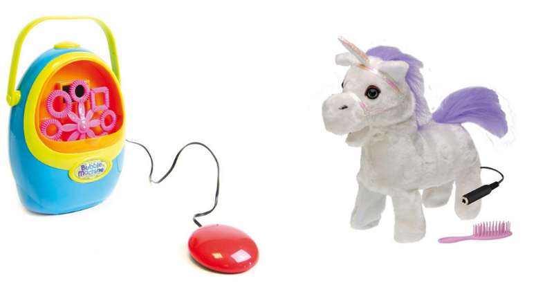 La peluche licorne – adaptée : Une peluche toute mignonne qui avance au trot, s’arrête un instant et secoue la tête sur des sons enchanteurs. Déjà adaptée pour être utilisée avec un contacteur grâce à une prise Jack 1/4. Fonctionne avec 2 piles AA fournies. Dès 3 ans.