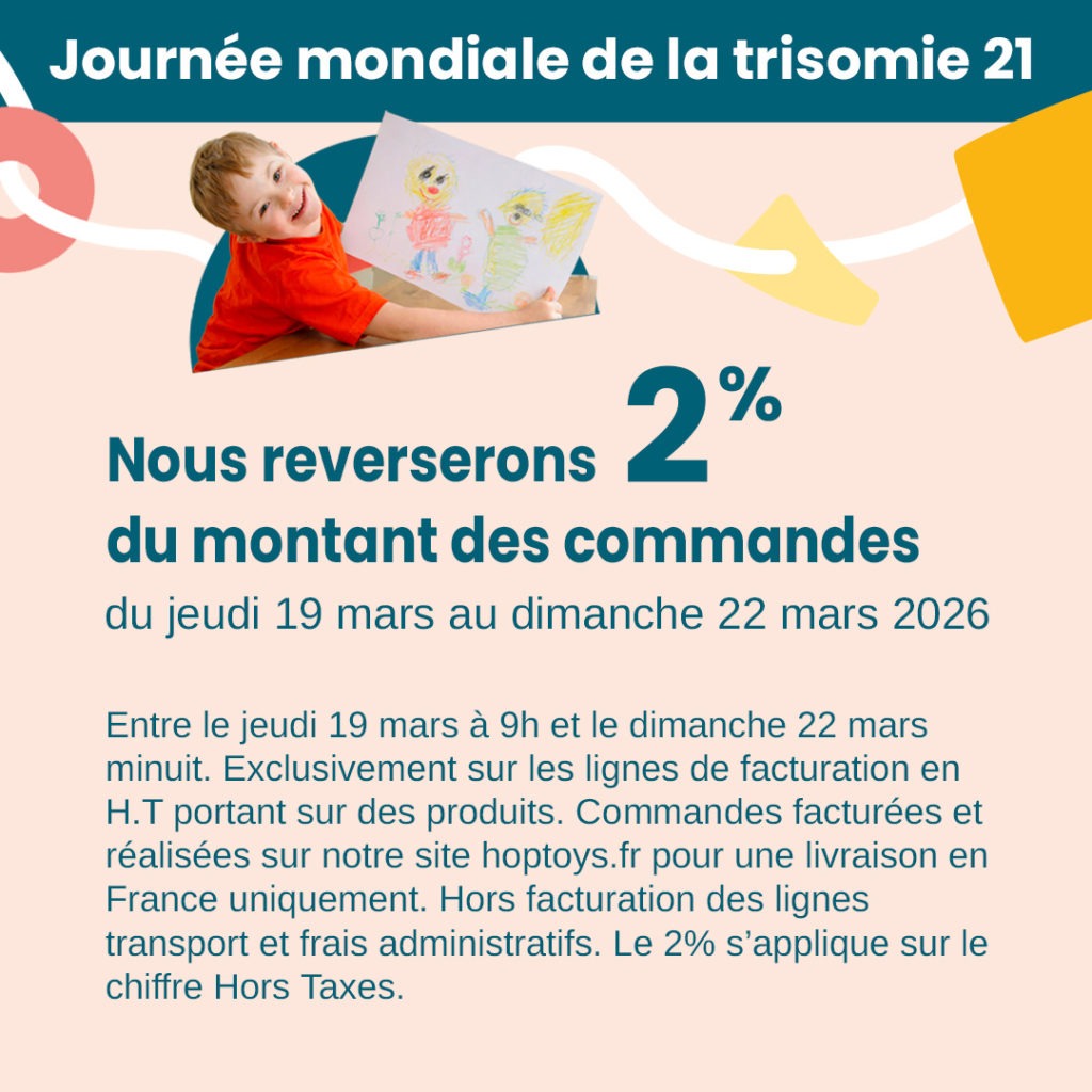 Entre le jeudi 19 mars à 9h et le dimanche 22 mars à minuit(1), 2 % des ventes de produits facturées(2) sur hoptoys.fr seront reversés à la Fédération Trisomie 21 France.
