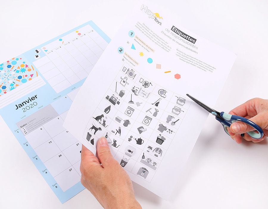 Quand les symboles sont choisis par les membres de la famille, il vous reste à découper et coller les pictogrammes des tâches à réaliser durant la semaine et les attribuer à votre famille. Grâce à cela, tout le monde sait exactement ce qui est sous sa responsabilité.