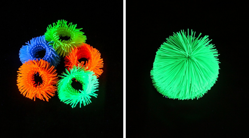 Grande balle pompon UV : Un bonheur à manipuler et à admirer dans le noir !On adore malaxer ses tentacules brillants grâce à la lumière UV. Un magnifique effet visuel lorsqu’on la lance en l’air. Prix : 9,90 euros.