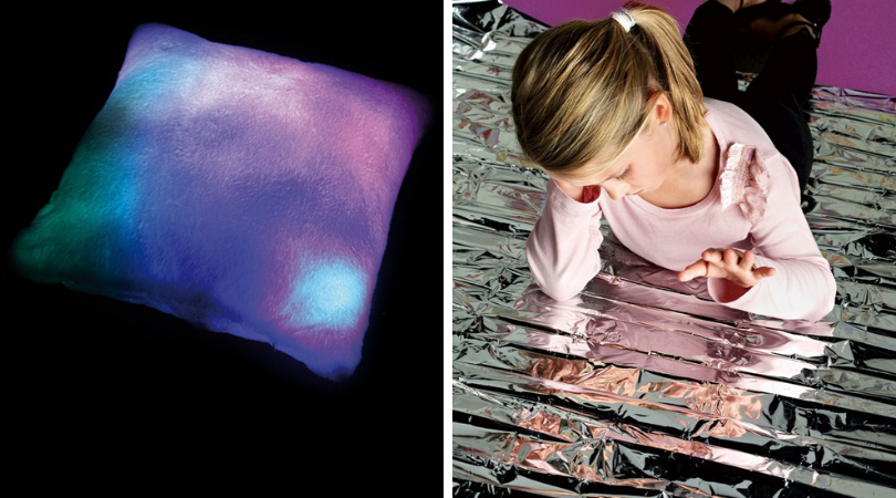 La couverture de l’espace par 3 : Elles sont habituellement utilisées comme couvertures de survie mais leur intérêt sensoriel a rendu leur utilisation fréquente. Idéales pour une exploration sensorielle autour du toucher, de la vision et de l’audition. Prix : 8,90 euros.