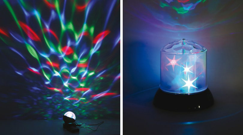 Mini-projecteur kaleidoscope : Un mini projecteur pour un effet maxi ! Une fois allumé, ce mini-projecteur tourne sur lui-même pour projeter sur tous les murs de la pièce des lumières mouvantes tricolores (bleu, vert et rouge) formant un mandala géant. Prix : 13,90 euros.