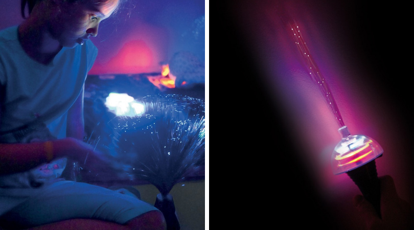 Lampe fibres optiques : La lampe fibres optiques fait partie de l’équipement de base pour créer un environnement sensoriel. Ces faisceaux de lumière invitent à l’exploration tactile et sa base lumineuse change de couleur selon un cycle prédéterminé, Un véritable enchantement pour les yeux et les mains ! Prix : 8,90 euros.