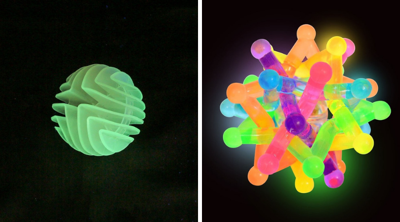 Flexiball UV : Cette balle UV ultraflexible est légère et durable. On aime également sa texture très singulière. Elle est idéale pour jouer dans une pièce sombre avec des projecteurs UV. C’est un outil parfait pour stimuler les capacités visuelles et motrices des enfants. Prix : 4,50 euros.